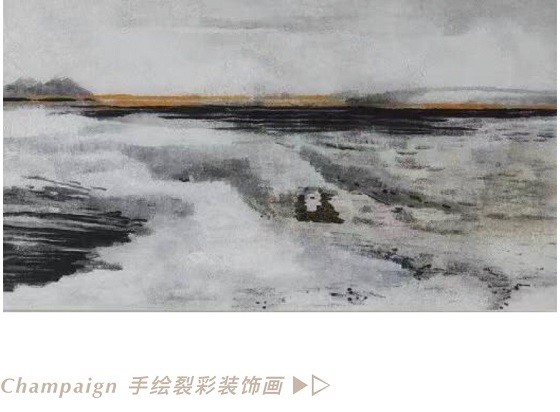 挂于床头的墙画也是新作之一,它以黑白灰为画面主色调,在玻璃裂彩的工艺铺陈下,颜料会自然出现开裂的细密肌理。