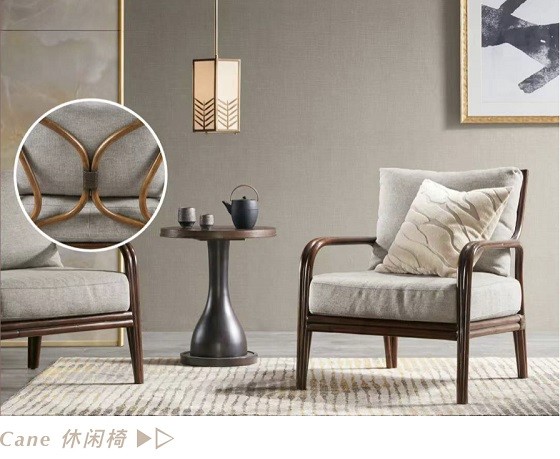 而纹理丰满的银鳞色亚麻面料、弧度柔雅的上等菲律宾藤被选用在Cane休闲椅上,它采用了单纯、大方的色调组合,通过朴、简的设计方式凸显了空间特征的清和静。