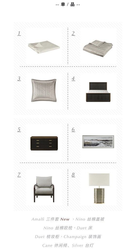 绵绵软软的Amalfi有诱人入睡的魔力,舒展之间,让疲惫的身体能够得以治愈,四周窄边的设计又增加了床品的精细和美观度。