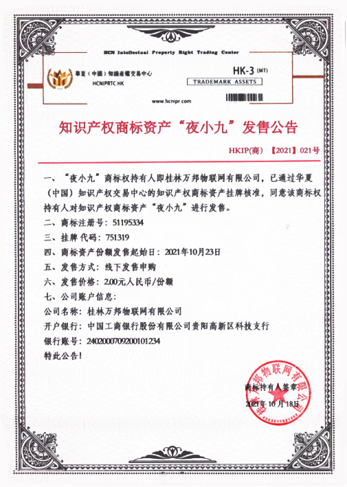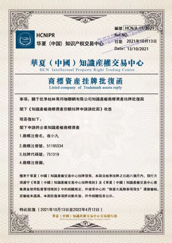 厚积薄发必有回响,积跬步终至千里!桂林万邦物联网有限公司经过近四年的辛勤奋斗,终于在2021年10月18日于华夏(中国)知识产权交易中心正式挂牌!挂牌代码:751319