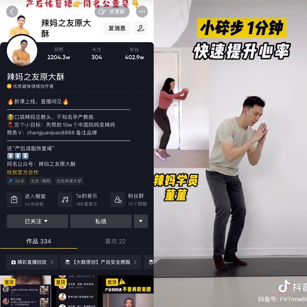 原大酥目前全网粉丝超过500万,主要专注产后人群的减脂及恢复教学,除了日常的视频更新,他还经常直播教学,一方面讲解产后恢复理论知识,另一方面带领产后妈妈们一同训练,回答大家关于产后恢复的各种问题。原大酥被大众所熟知的身份是一名视频博主,具备美国ACE认证教练,美国Fit for Birth认证孕产体适能教练等资质,有着过硬的专业知识。他的另外一重身份是FitTime睿健时代旗下产品口袋辣妈营的金牌教练,主要负责短视频内容规划、产出以及KOL的孵化。原大酥表示,目前发布的教程类视频大部分来自口袋辣妈营的产后课程,自己也是口袋辣妈营产后瘦身恢复体系课程的主要研发人员之一。