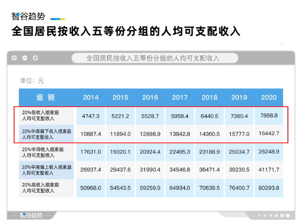 2020年,中间收入的20%,月可支配收入2000元出头;20%中间偏上收入组,月人均可支配收入也不到3500元。