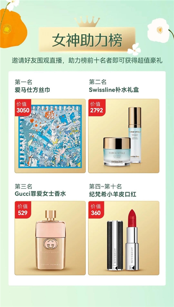 无法参与线下分享会的会员,还可以通过伊丽汇小程序官方直播,和伊能静、何姿云见面,在线沉浸式参加公益艺术展。同时,直播间还设置了签到礼、助力榜、乐享礼、抢888万无门槛红包等玩法,签到100%中奖,助力榜第一名还可以获得爱马仕丝巾,惊喜福利送不停。