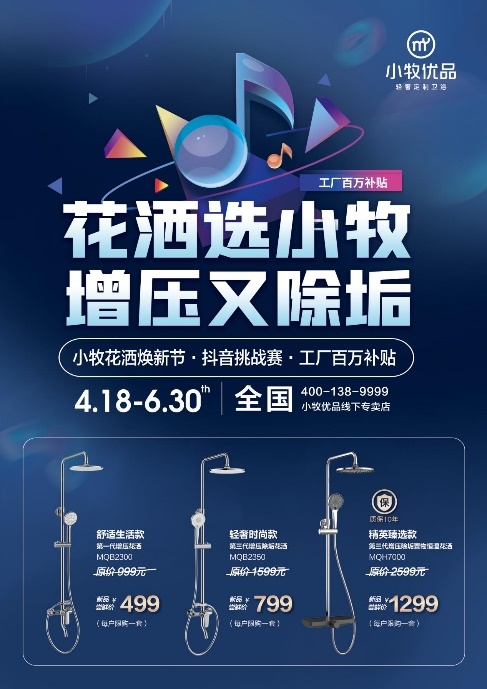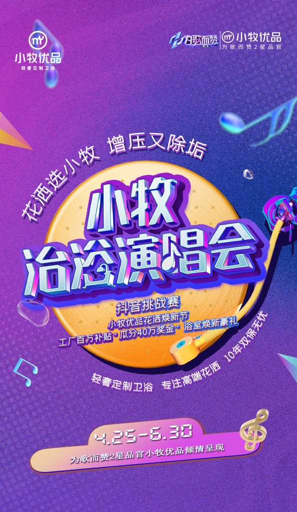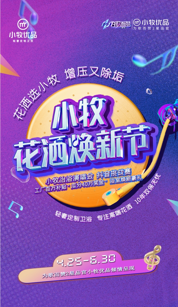 小牧跨界破圈直抵人心,花洒节期间将作为热门音乐综艺《为歌而赞2》星品官,发起“小牧治浴演唱会”抖音全民挑战赛,为向往“乐生活”的年轻人开辟出释放自我的新天地。
