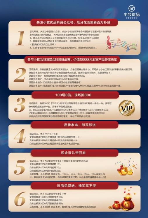 参加小牧治浴演唱会抖音挑战赛,还有机会瓜分40万奖金,榜单前100名,将获赠小牧精心准备的智能马桶、恒温花洒、浴室柜、电热毛巾架等浴室焕新大礼包!