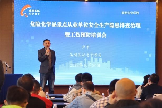 培训分为两期,分别于10月20日和21日举办,区内(化工)危险化学品生产、经营(带储存设施)企业、储存使用剧毒危险化学品企业、危险化学品重大危险源企业、天府生命科技园和前沿医学中心代表企业安全管理人员及区内学校代表共计100人参加。