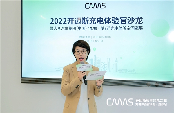 11月18日,由开迈斯新能源科技有限公司、大众汽车集团(中国)联合主办的开迈斯充电体验官沙龙(成都站)暨大众汽车集团(中国)“众充 随行”充电体验空间巡展在成都成华区印象城隆重举行。本次沙龙旨在向新能源车主用户介绍开迈斯全场景充电解决方案,同时为用户们带来开迈斯核心充电场景下的最新用户充电旅程。本次沙龙活动诚挚邀请了成都地区近30余位新能源电动车主参加,现场受邀车主正式成为开迈斯智享纯电之旅充电体验官。