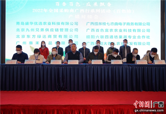 本次活动由广西壮族自治区商务厅、百色市人民政府共同主办,以“百香百色·瓜果飘香”为主题,百余名区内外大型采购商代表和百色市供应商代表以线上线下的方式参会。经前期沟通与现场洽谈,本次对接会共有8对企业达成签约意向,签约金额共计2.3亿元。