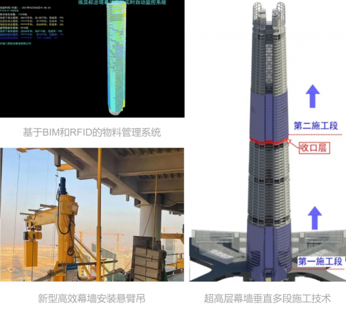 《超高层建筑幕墙高效施工技术》以“非洲第一高楼”——高达385.8米的埃及新首都标志塔为实施对象,针对海外项目工期紧、海运周期长、属地资源匮乏等情况,研发了超高层幕墙垂直多段施工技术、新型高效幕墙安装悬臂吊、基于BIM和RFID的物料管理系统,实现了施工工艺、装备与管理三方面技术突破,突破了现场材料存放场地紧张、大风天气多等环境限制,大幅提高了超高层幕墙安装效率。基于此技术,标志塔项目建设创造了海外工程幕墙板块单日最高安装183樘的记录,实现了385米的超高层幕墙6个月内大面积封闭,刷新了国内外超高层幕墙安装速度记录。
