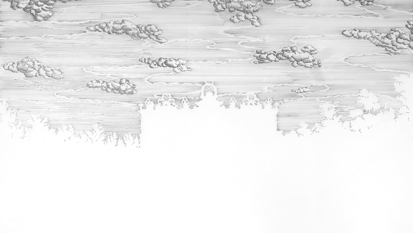 2023年7月3日,人类创造了12万年以来的最高气温,当天全球平均气温17.01摄氏度。但是,7月4日、7月5日的酷热很快就让前面这项纪录作古。人类和天气的关系在日益紧迫的垂危现实中变得更加紧密。在北丘当代美术馆的委任作品《气候病》(2023)中,新媒体艺术家侯江南与胡昀合作,以天气交互动画的方式讨论了气象与人类历史之间的关系,以及殖民史视角下的环境史问题。作品根据中国南京的实时天气数据显示相应云图,在展厅宛若瞬息万变的内部气候一般发生变化;在画面上方飘荡的各类云朵图像由艺术家从一组清宫铜版画中提取——它们来自清内府宫廷满族画家伊兰泰奉乾隆帝旨绘制,并由中国工匠雕刻的《西洋楼透视图铜版画》,后者描绘的对象正是侯江南故乡的景观——北京郊外曾经显赫一时,却最终在19世纪60年代被英法联军摧毁的圆明园。
