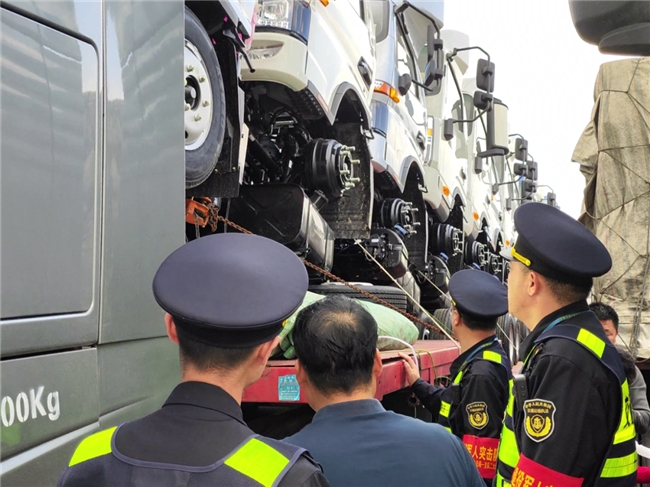 2月18日,正在路面巡查中的退役军人突击队队员注意到一辆载有一排货车车头的大货车,车辆因装载超高而隐患重重。退役军人突击队迅速采取行动,队员们通过喊话警示驾驶员,并开启双闪尾随其后,引导该货车安全驶入服务区。
