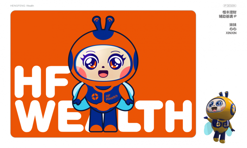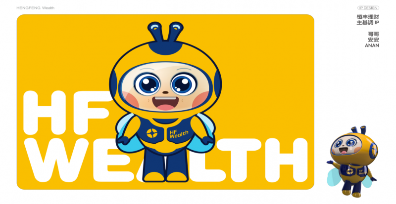 恒丰理财IP形象由主基调IP“安安”和辅助基调IP“心心”组合构成,形象的灵感均来源于具有“天才建筑师”之称的蜜蜂,具有财富之“丰”(蜂)的品牌定位。“安安”“心心”头部的触角是探照灯的造型,意为照亮大众的财富之路;像星辰一样的大眼睛代表着为客户洞察内外部局势,密切关注财富走向;在头部两侧,设计了铜币样式的耳朵,意为探听最新财富消息;翅膀寄托了财富羽翼带动人生向上跨越的美好寓意。
