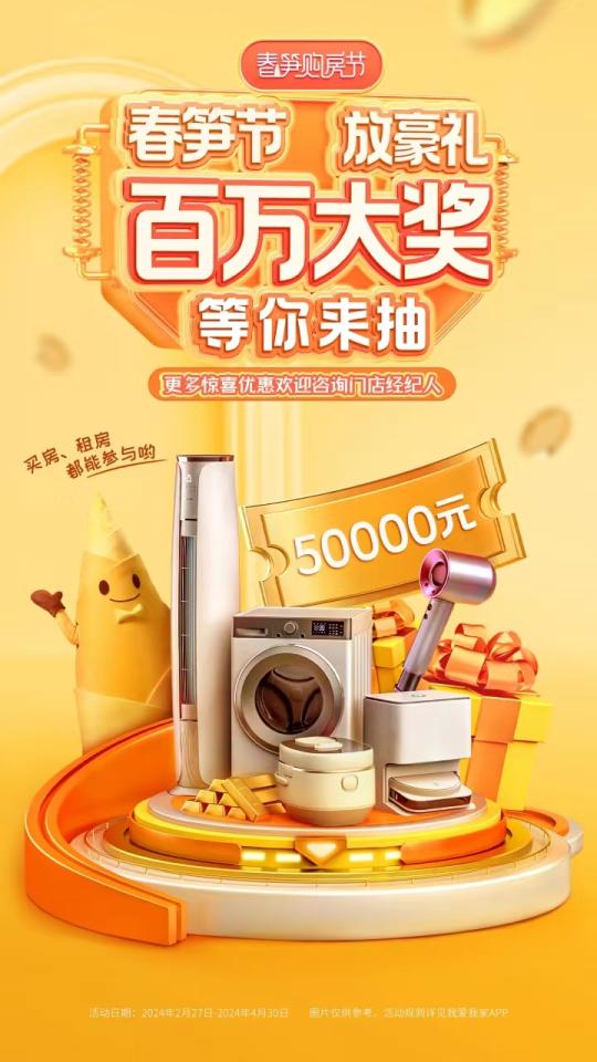 据悉,我爱我家第二届“春笋购房节”将持续到4月30日,有租、购房需求的用户均可登录我爱我家APP或小程序,选择有意向成交的城市报名参与活动。登陆或成交均有不同奖项设置,惊喜不断,体验扎实。